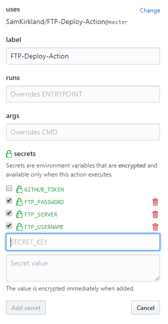 • Set actions by editing the action then adding them in the secrets section: